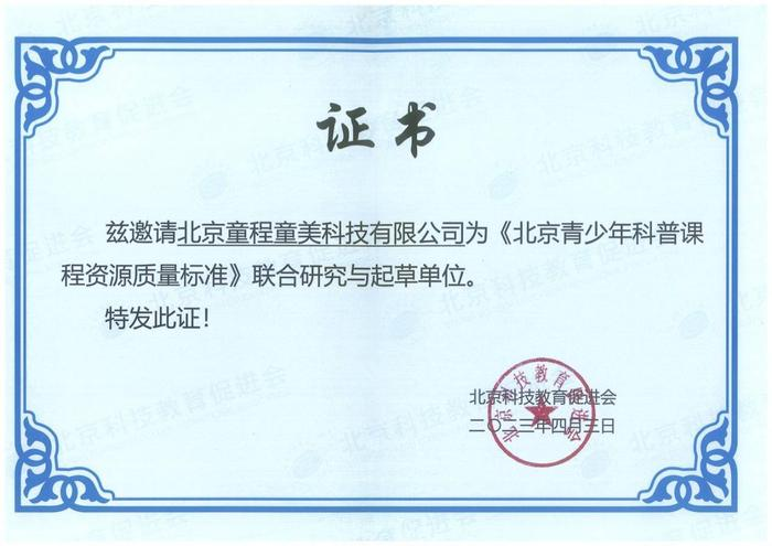 为贯彻落实“双减”工作精神和要求,北京科技教育促进会联合童程童美等机构,联合发起并推动青少年科普课程资源标准和校外科技教师基本能力标准研制和推广工作,以引导和帮助科技培训机构通过加强培训内容质量和科技教师队伍建设,提升培训层次、水平和质量,助力科技培训行业规范运营和高质量发展。