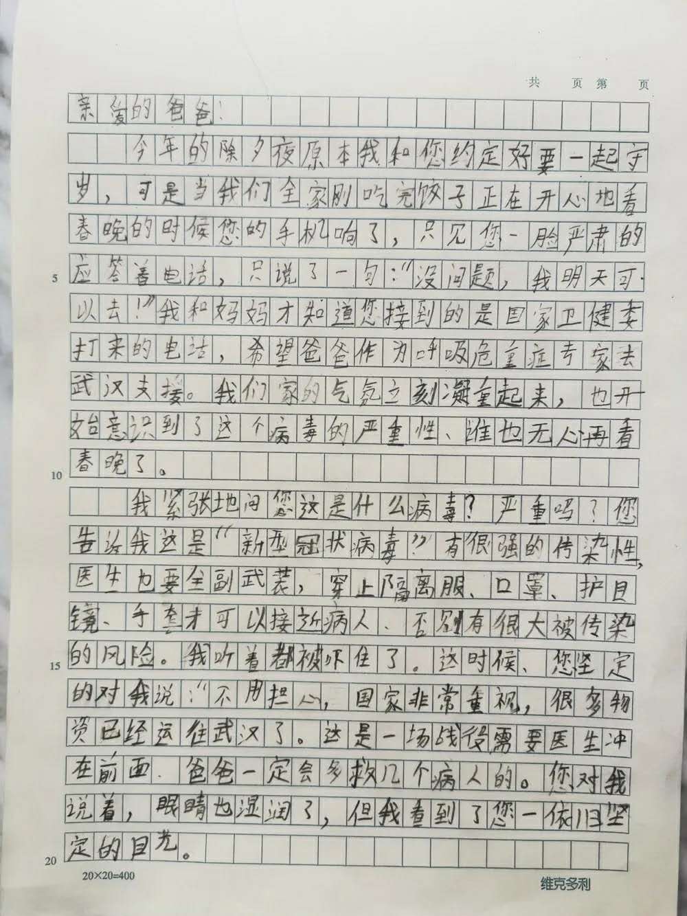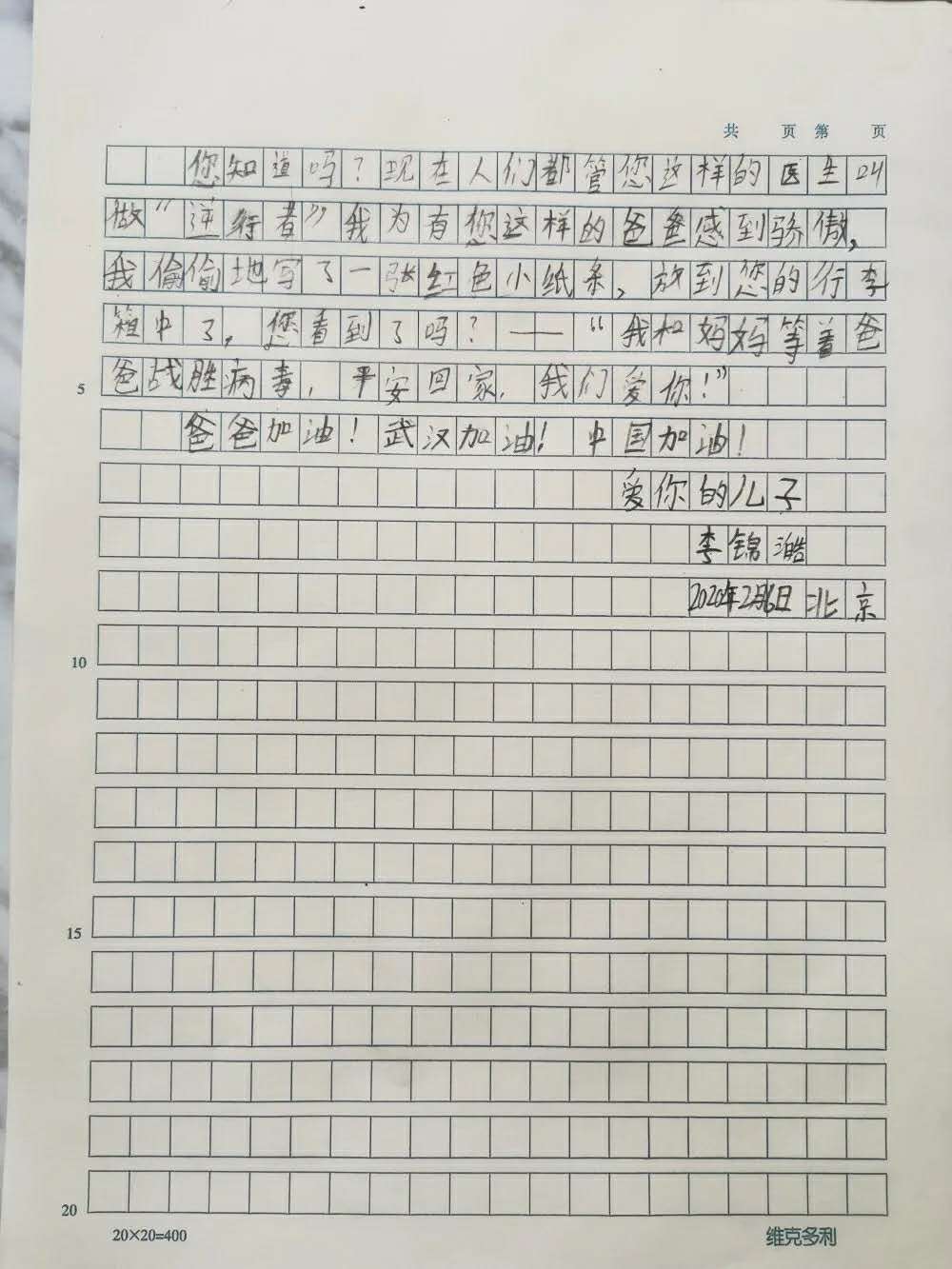 待在家的日子里,在学习学校安排的网课之余,妈妈时常会录下锦澔开心地学习编程的小视频发给爸爸,让爸爸在结束一天的救治病患工作之后能感受到来自家的温馨和快乐,一家人就用这种特殊的方式彼此陪伴。期间,特别想念爸爸的时候,锦澔还给爸爸写了一封家书,诉说思念,并表达了对爸爸的崇敬之情。