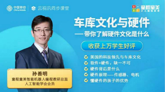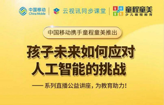 中国移动云视讯与童程童美强强联合,紧扣人工智能时代主题,结合自身强大的平台资源及师资资源优势,推出“孩子未来如何应对人工智能的挑战”主题公益讲座,共同为教育助力。