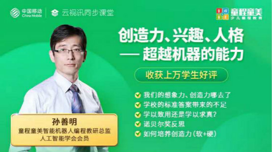 3月29日(本周日)14:00-15:30,童程童美智能机器人编程教研总监孙善明,将带来“创造力、兴趣、人格——超越机器的能力”线上直播讲座,与大家一起探索“我们的想象力,创造力哪去了?”寻找答案的背后,知己知彼,帮助孩子更好的应对人工智能时代的挑战。