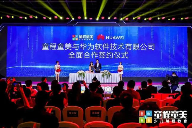 活动现场,童程童美未来教育研究院与华为云签署了全面合作协议,首席教育官孙莹女士与华为云北京总经理陈航出席了签约仪式。
