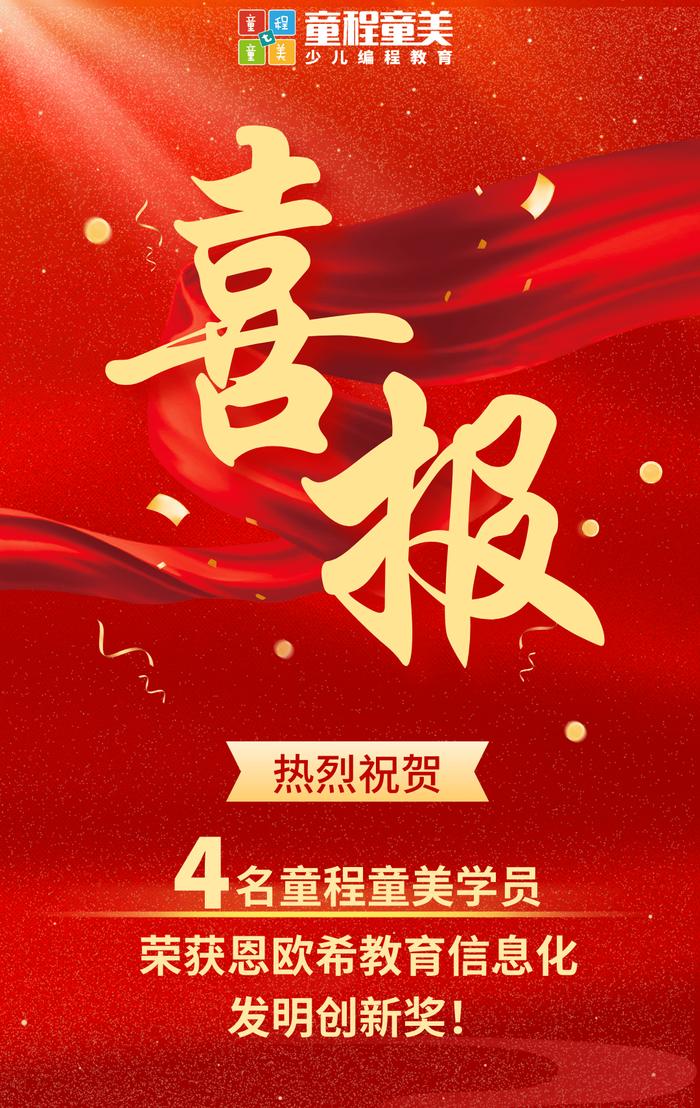日前,全国中小学信息技术创新与实践大赛(NOC)项目比赛最高奖项“恩欧希教育信息化发明创新奖”揭榜。在本年度的恩欧希大奖评选中,有25名入围选手来自童程童美,最终,4名童程童美学员荣获这项国家级科学技术奖。值得一提的是,全国仅有49名学生获此殊荣。