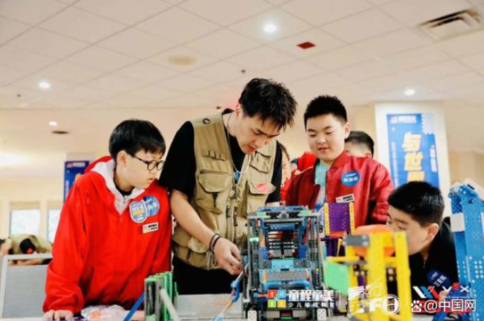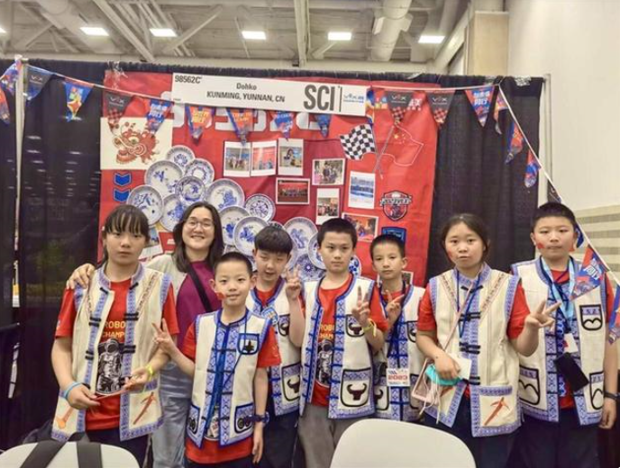 2023年4月,在美国达拉斯举办的第十五届VEX世锦赛现场,几位中国少年形成了一道靓丽的风景线。青花瓷拼成的龙元素在中国红的背景上一跃而出,向世界展示着中国文化的绚丽多彩。据悉,他们是来自中国知名少儿编程与机器人教育机构童程童美的参赛选手。