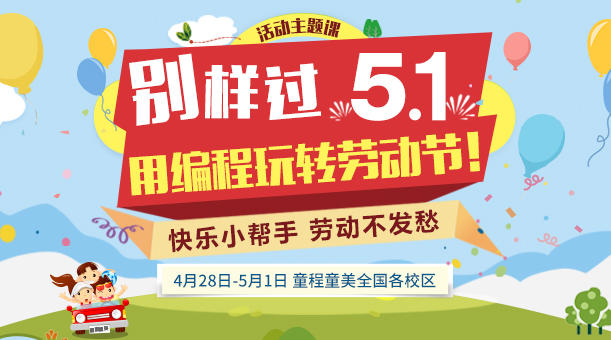 童程童美推出五一主题活动课——用编程玩转劳动节!闯关赢童币,趣味学编程,幸运大抽奖,好礼送不停!活动时间:2018年4月28日-5月1日,童程童美全国校区火爆开启!