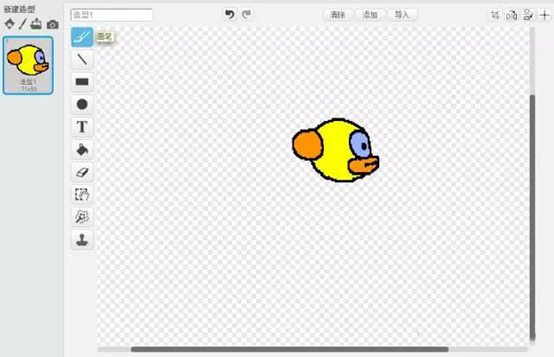 删除角色列表中的默认的小猫,点击绘制新角色。使用画笔工具绘制一个小鸟,用填充工具添加颜色。如果角色有点大,用缩小工具点击小鸟,把它缩小放在舞台合适位置。给它取个名字“笨鸟”。
