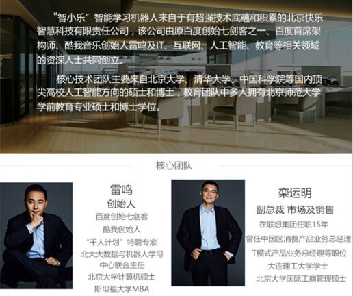 月28日,一款名为“智小乐”的儿童智能机器人在京东上发起了众筹,这是一个成立于2015年的公司,去年9月开始了智能教育机器人项目,今年4月进入产品内测阶段——这一切看起来都只是一个初创公司的正常信息。但引人注意的是,在这个产品众筹的网站介绍上,其核心团队介绍当中,创始人一栏,赫然是百度创始七剑客之一的雷鸣。